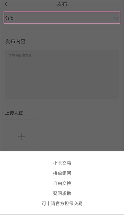 3、最后根据你的交换需要选择分类,填写内容、上传凭证,点击提交即可交换区显示。