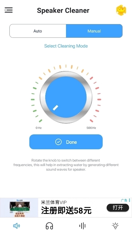 SpeakerCleaner中的手动清洁选项可让您更好地控制清洁过程。频率范围为0-8000hz,因此您可以为手机选择最佳频率。选择频率后,按下喷水快捷按钮,安卓的喷水将立即提供干净的扬声器。