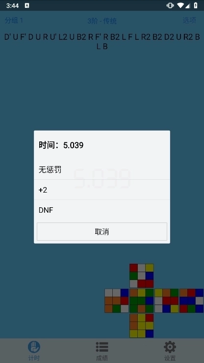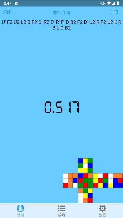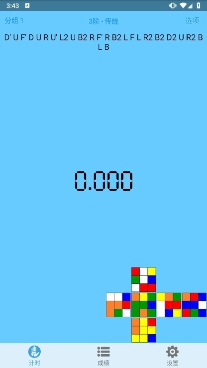 【计时】:除了常规的计时外还支持WCA观察、启动延时,每次计时结束后可确认+2/DNF,计时精确度为0.001秒。