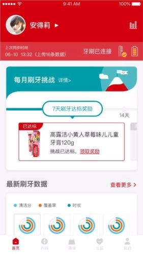 6、支持连接家人的牙刷并查看其使用情况,切换牙刷类型后就能查看对应的数据,同时还会给出刷牙建议;