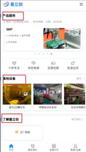 1、打开软件,在首页可以看到嘉立创的产品和基地设备,当然还有更多关于嘉立创的内容可以了解;