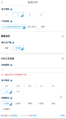 嘉立创科技是一款由深圳嘉立创科技集团股份有限公司发行的专门针对自家公司生产的电子元件等进行的自动下单购物软件,该软件是支持全国的用户使用的,是有很强大的功能的,可以在这里自助下单各种各样的产品,可以直接帮助你在线计价,只需要对板材类型、板子尺寸、板子数量、板子层数、产品等等进行真实填写,就可以直接快速的计算出,帮助用户查看价格。