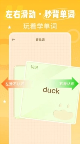 智能规划复习节奏,有效对抗遗忘;单词配备原声发音,助你掌握其在真实语境中的实际用法;解析词根词缀,帮你理解单词的内在构造;呈现地道搭配,让你明晰单词的多重词义。通过左右划动操作,就能将单词标记为“认识”或“不认识”,轻松打造个人专属生词本;还支持随时添加新单词,你可以创建完全属于自己的生词本。用单词鸭背单词,在趣味玩乐中高效学会单词!