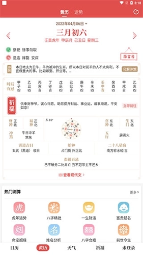 天天吉历手机版是上海润吉网络科技有限公司开发的一款手机日历万年历应用,能为用户提供日历查询、天气预报、事项提醒等服务。用户可以在这里查看日历详情,了解每日宜忌,还能查询各类天气信息。此外,软件还融入了算命、祈福香火、周公解梦等传统文化内容,实现了传统文化与日常生活的巧妙融合,同时也支持日程管理功能,感兴趣的用户不妨体验一下!