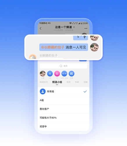 【频道管理】专属@你的成员且消息仅TA自己可以看到,专属@分组,实现更自主的管理方式;限制成员互加好友,创建属于自己的社群。