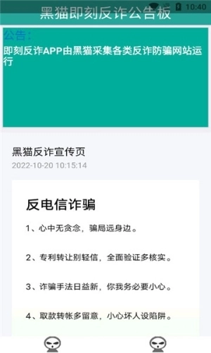 黑猫即刻反诈是一款专门为帮助用户防诈骗的服务类软件,该软件中是有很强大的功能,可以帮助用户被诈骗。随着互联网的不断发展,骗子骗人的手段层出不穷,用户们都是防不胜防,这就需要一款能够帮助用户防诈骗的。能够直接通过该平台去查询可疑的手机号码,举报网络不良的垃圾信息,直接点击启动就可以轻松办理,还提供了更多的举报受理中心,帮助大家不断的提高自己。
