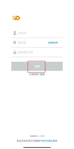 1、用户打开软件后,系统会自动跳转至注册登录页面,输入手机号和验证码,然后点击注册按钮。