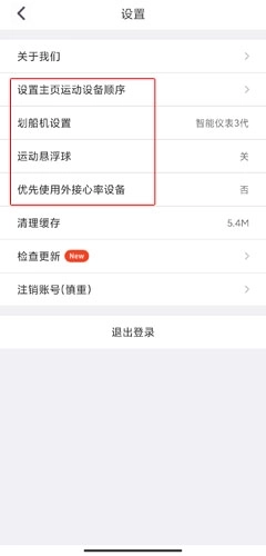3、设置功能,用户能够在该页面里依据自身需求,对设置主页运动设备顺序、划船机设置、运动悬浮球、优先使用外接心率设备这四项内容进行设置。