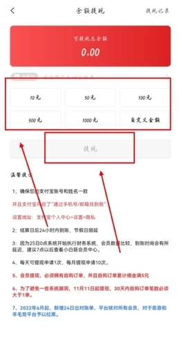 2、直接选择对应的金额,或者自行设置自定义金额,最后完成提现操作即可。【需要注意的是,若想顺利提现,需先绑定好个人支付宝账号,才能进行后续步骤】