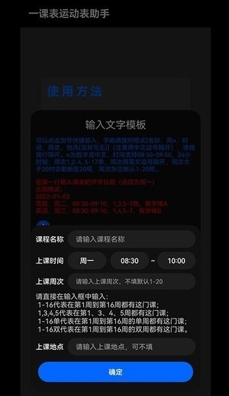 如果为安卓设备,可以直接在助手上点击传输添加课程,也可以借助鸿蒙设备进行课表获取。借助同学的鸿蒙设备安装一课表鸿蒙版,打开一课表手机应用后在里面按照应用指示添加课程表,添加并完善课表后回到该课表的课表编辑界面,课表编辑界面为可以修改开学日期、课表名称的界面。随后点击右上角的三条杠-导出课表-导出文字模板(GT),此时导出后的数据已在粘贴板上,随后将文本粘到点击传输后弹出的输入框(注意:此时的数据不包含开学日期,请务必在第一行加上你的开学日期),点击确定即可。