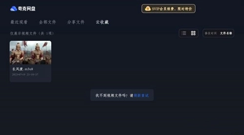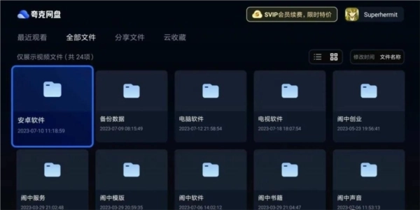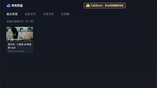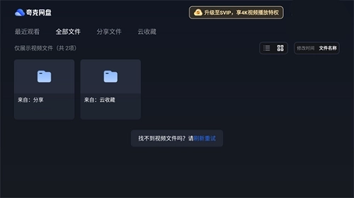 2、进入默认显示全部文件夹,但是能看到的只有视频文件,其他文件会被屏蔽,最上方是夸克网盘LOGO,下面的菜单栏依次是最近观看、全部文件、分享文件、云收藏