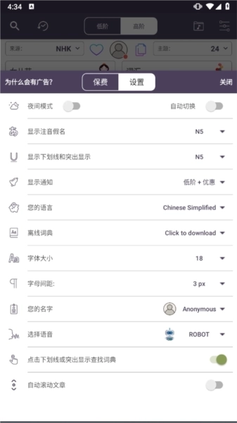 然后在设置页面中你您可以按照喜好更改设置:夜间模式,显示/隐藏注音假名,推送通知,设置语言。