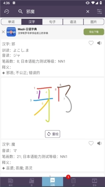 在词典页面中,你可以通过查找词汇表、汉字,示例和语法,帮助您轻松地学习日语。