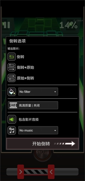 3、然后可以选择倒转、特效、视频质量、背景音乐,选择好后,点击开始倒转;