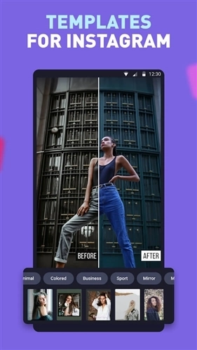 故事视频和帖子的模板。您可以使用此Instagram编辑应用程序中的所有布局,既可以将故事用作垂直格式,也可以将正方形用于常规文章。因此,您可以根据需要将单个主题应用于帐户中的所有帖子。