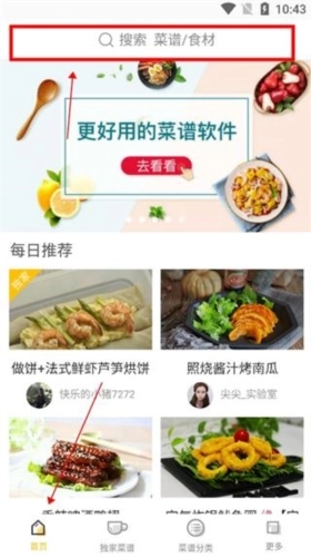 1、在本站软件安装注册后,打开软件到首页,点击首页最上方搜索菜谱