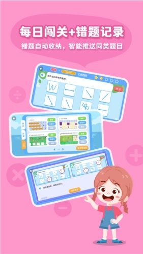 3、每日闯关+错题记录:每天5道思维练习题,培养孩子坚持的好习惯。同时每日闯关的错题会自动收纳,推送同类题目,方便家长了解孩子每次练习情况,同时帮助孩子查漏补缺。