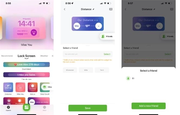 一旦你们都成为Widgetable上的朋友,你将需要选择你的小部件并进行设置。在应用程序中,点击屏幕底部的探索。例如,选择一个像矩形距离这样的小部件。选择你要与之一起使用的朋友,然后点击保存。