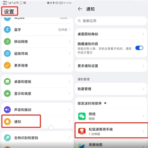 1、手机打开【设置】,点击【通知】,进入通知页面设置。找到【松鼠速客骑手端】,点击进入通知页面。