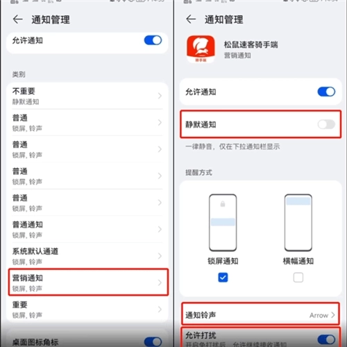 2、找到【营销通知】,进入通知管理,关闭【静默通知】,打开下方的【允许打扰】,设置想要的通知铃声。