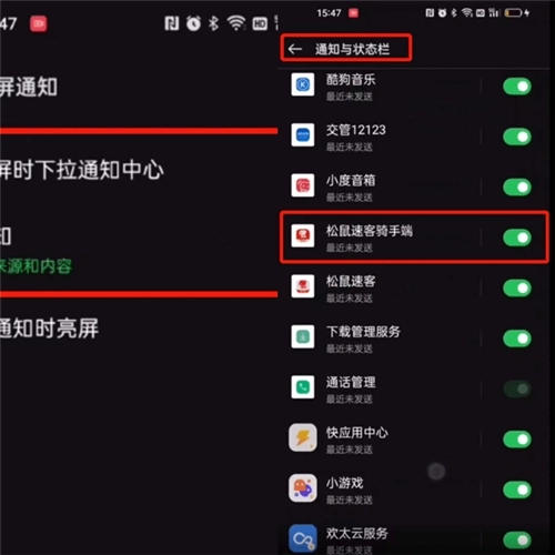 2、开启锁屏通知,回到【通知与状态栏】,向下滑动,找到【松鼠速客骑手端】,点击进入页面设置。