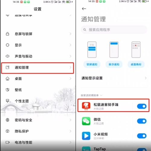 1、打开手机【设置】,找到【通知管理】,进入页面设置,找到【松鼠速客骑手端】,进入页面设置。