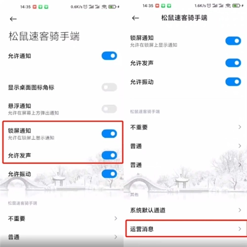 2、打开【锁屏通知】和【允许发声】,向下滑动,找到【运营消息】,进入页面。