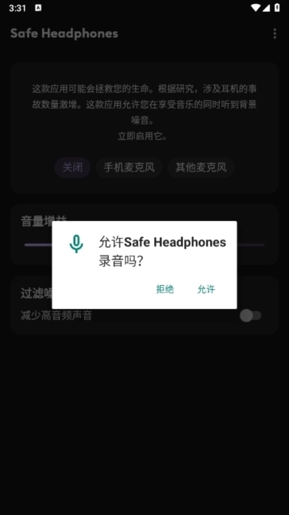 运行SafeHeadphones后需要获取录音权限,否则无法使用。