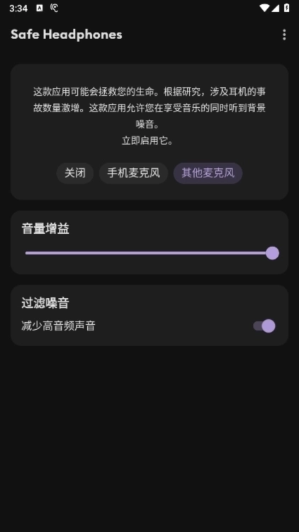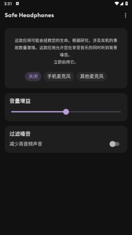 SafeHeadphones是一款能够将你的耳机变为透明模式应用,就是让你即使在戴着耳机的情况下依然能够听得到周围环境声音,比如让您在听音乐时依旧能够听到背景噪音和汽车喇叭声,如果有人有听力损失,此应用程序还可以用作助听器。该应用程序也适用于蓝牙耳机。通过集成先进的技术和结构,安全耳机不仅提供更清晰、更响亮的声音,还可以在周围环境中提高用户的听力体验。该应用程序具有独特的功能,如快速选择不同的模式,控制音量和噪音过滤,让用户即使在嘈杂的环境中也能享受到清晰的音乐和语音。无论是在家中、办公室还是汽车中,安全耳机都能为用户提供安全、清晰的听觉体验。