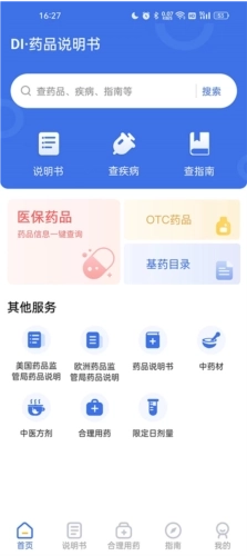 打开好的后,无需注册就可以使用大部分的详细功能。在首页就有三大最常用的功能:说明书、查疾病以及查指南,下面小编为你一一分析其作用。