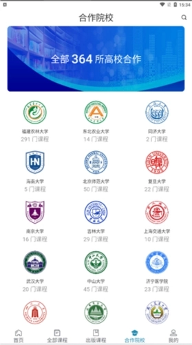 4、在合作院校板块能够查看所有合作院校的信息,点击对应的校徽即可浏览该校开设的课程内容。