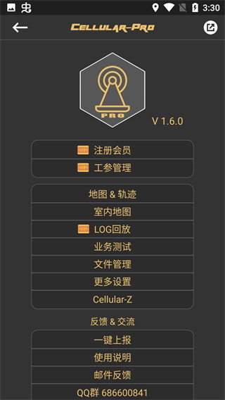 更多功能涵盖会员购买、详细信息查看、工参管理、地图轨迹、测试文件格式记录、反馈以及使用说明等。当前会员分为普通会员与高级会员。普通会员可实现针对LTE网络的锁Band、PCI以及锁Earfcn功能。高级会员功能更为强大,除具备普通会员的功能外,还包含详细信令查看、详细信令导出、工参导入、60分钟轨迹导出、不限时业务测试以及更多LOG支持等。
