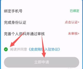 4、在符合要求的情况下,点开“《皮皮陪玩入驻协议》,确认无误”,然后点开“立即申请”,进行报名。