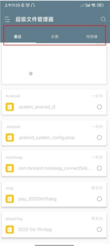 re文件管理器的使用方法如下: 1. 打开软件后,能够查看最近使用的文件、按分类整理的文件以及设备的内部存储内容。