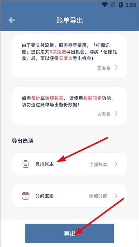 进入账单导出页面后,用户可以选择要导出的账本范围、时间范围等信息,点击页面下方的“导出”按钮,就能完成所选账单的导出操作。