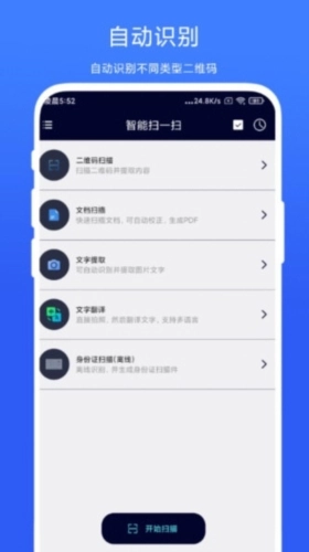 智能扫一扫是一款功能强大的扫描识别软件,具备快速、准确的特性。它支持通用二维码与条码识别等多种扫描效果,能满足不同用户的多样化需求。同时,该应用还提供文档翻译、PDF生成等实用功能,为用户带来极大便利。作为一款智能扫描提取软件,智能扫一扫可自动识别各类二维码和条码。用户能轻松扫描文字并实现自动翻译,有效节省翻译时间。此外,它支持离线扫描身份证并生成PDF文件,切实保障用户信息安全。