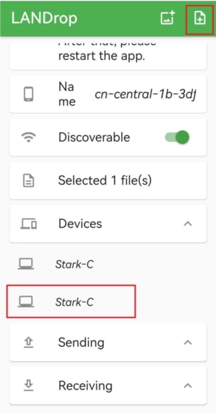 3、打开手机,点击右上角的【选择文件】按钮,找到需要传输的文件,手机里的任意文件都可以,图片、视频、文档都没问题!我这里选的是一段视频。选好要传输的文件后,LANDrop会自动列出你的电脑设备,点击一下就能开始传输。