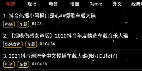 车载大碟、电音、重低音、古风音乐、烟嗓、8d全景环绕、高清hifi、喊麦现场、网络神曲、泰式电摇、磁性女声、越鼓节奏、草原歌曲、蹦迪舞曲大全。