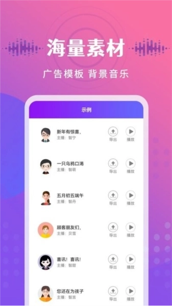 3、丰富多样的样音文案模板与优质背景音乐,助你打造专属配音效果,还有大量真人成品录音可供挑选。