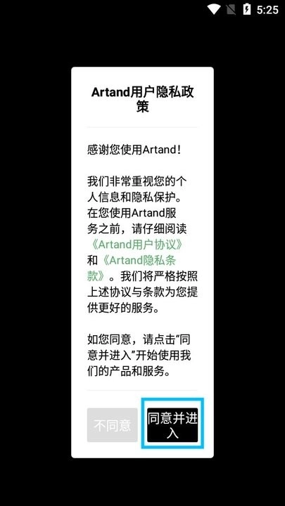 在itmop安卓网打开Artand应用,仔细阅读弹出窗口中的内容后,点击页面上的【同意并进入】按钮。