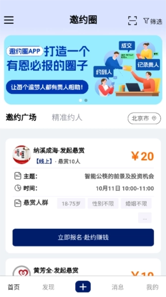 邀约圈是深圳市邀约圈信息技术有限公司开发的一款实用的商务邀约工具,能助力企业精准邀约所需人才,有效降低获客成本,让问题解决更高效。平台支持用户发布悬赏邀约,其他用户可查看悬赏信息并报名参与,操作十分便捷。若您对这款软件感兴趣,不妨立即体验!