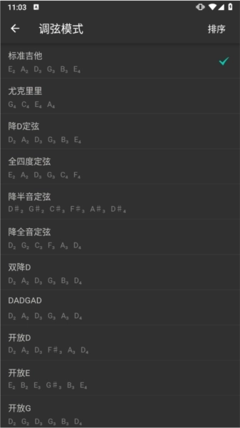 选择调音模式:通常有吉他、尤克里里等乐器模式可选,选择对应的乐器模式。