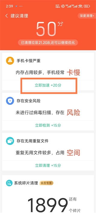 4、清理完成后这边可以看到有【手机卡慢严重、存在安全风险等等的专项清理】