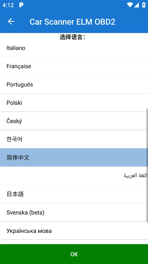 1、启动Car Scanner汽车扫描仪应用程序,第一步需将操作语言设置为简体中文;