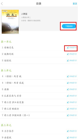 6、当教材选定完毕,用户既能够直接进入学习界面,也可以点击“课本”按钮,把相关内容保存到本地,方便离线阅读与使用。