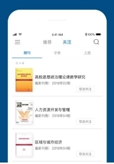 4、进入关注板块,查看自己关注的期刊、学者及主题词相关信息,并阅读最新的期刊内容
