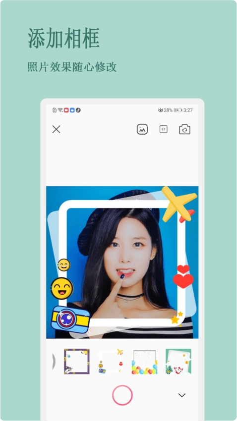 在相机模式下,您可以选择喜欢的滤镜和相框,为照片增添独特的风格。