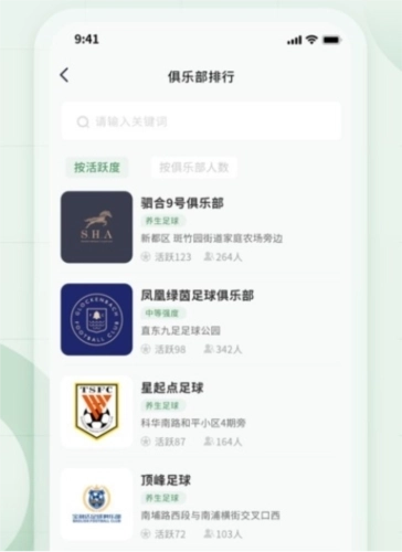 3,俱乐部排行:同城俱乐部排名榜单,展示活跃度