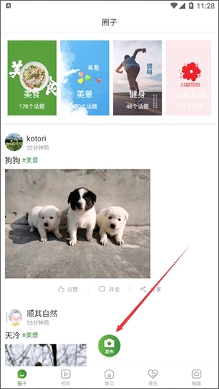 2、在“圈子”页面,我们能够浏览他人发布的信息,你也可以点击“发布”按钮来分享自己的内容。
