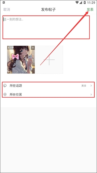 3、编辑好您想分享的内容,接着挑选话题分类并选择位置信息,最后点击右上角的“发表”按钮就完成啦。